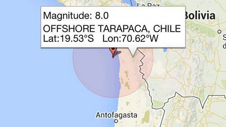 El primer informe del Centro Sismológico Nacional (CSN) señaló que un terremoto de magnitud 7,8 en la escala de Richter se registró este martes en el extremo norte de Chile. Minutos después la USGS, de Estados Unidos, señaló que fue de 8,0 grados.