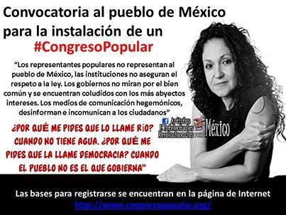 La periodista mexicana Sanjuana Martínez compartió en su página de seguidores la convocatoria al Congreso Pupular, que se llevará a cabo este miércoles en el monumento a la Revolución en el Distrito Federal, cuyo objetivo es crear un Congreso mexicano alterno, formado por ciudadanos.